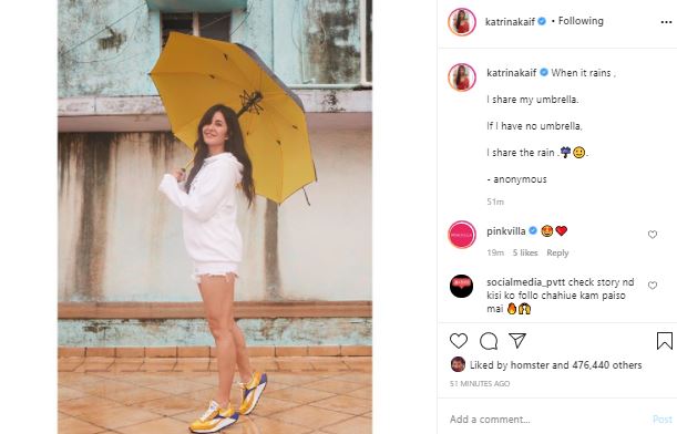 The 'Tiger Zinda Hai' actor posted to Instagram an adorable picture as she holds a big yellow umbrella as the prop. In the picture, Kaif is seen in a casual avatar as she flaunts her long legs while sporting white ripped denim shorts with matching hoodie and yellow sports shoes. The actor is seen holding a yellow umbrella as she leaves her luscious locks open while smilingly posing for the camera.