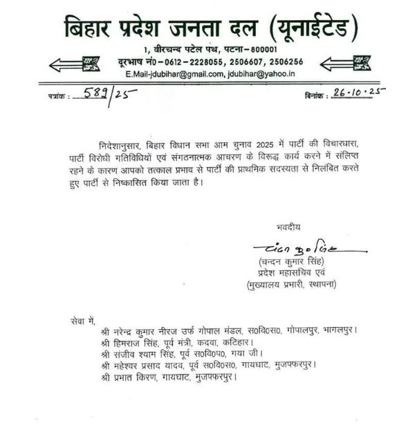 JDU State General Secretary Chandan Kumar Singh issued the expulsion letter. The prominent leaders who have been suspended include former Munger-Jamalpur minister Shailesh Kumar, former Jamui-Chakai Legislative Council member Sanjay Prasad, former Siwan-Baraharia MLA Shyam Bahadur Singh, former Bhojpur-Barahara MLC Ranvijay Singh, former Sheikhpura-Barbigha MLA Sudarshan Kumar, Amar Kumar Singh, a resident of Sahebpur Kamal in Begusarai district, Dr. Asma Parveen of Vaishali, Luv Kumar of Aurangabad, Asha Suman of Katihar, Divyanshu Bhardwaj of East Champaran, and Vivek Shukla of Siwan. The party stated that indiscipline and anti-party activities will not be tolerated during the elections.
