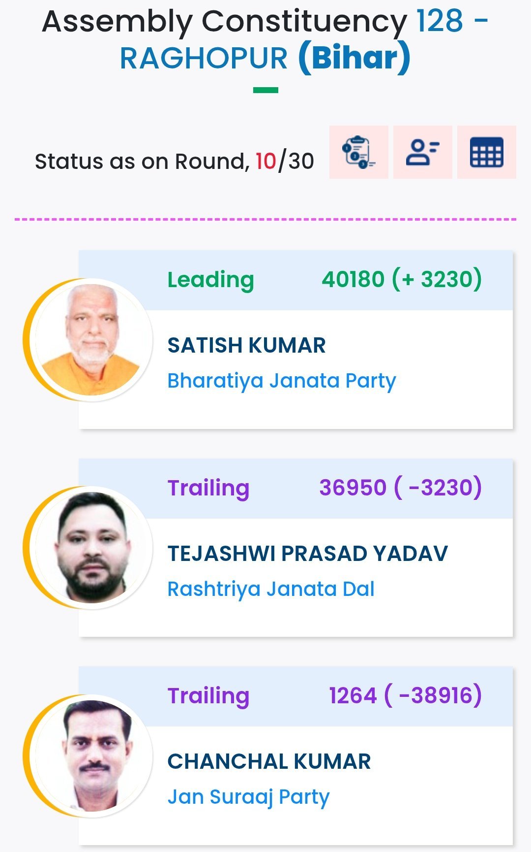 After the 4/30 round of counting, RJD CM candidate Tejashwi Yadav is trailing by 3,016 votes in Raghopur, with BJP’s Satish Kumar leading.
