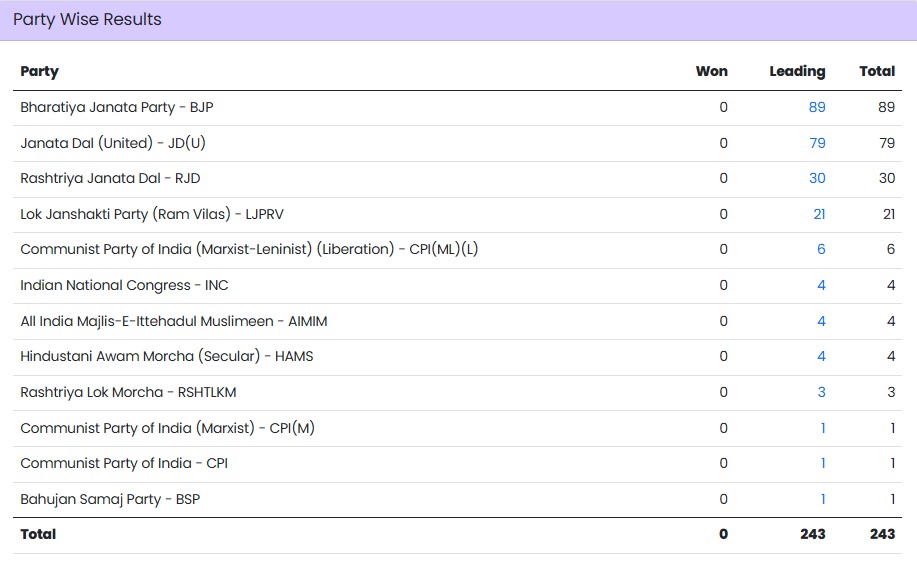 Live Bihar 2025 trends show NDA ahead on 175 seats, with JDU emerging as the largest party in the assembly.