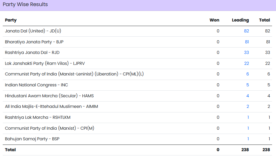 According to Election Commission data, BJP is leading as the largest party with 25 seats, followed by JDU-18, RJD-14, Congress-3, LJP (Ram)-6, TPLRSP-1, HAMS-1 and Left-1 in early trends.
