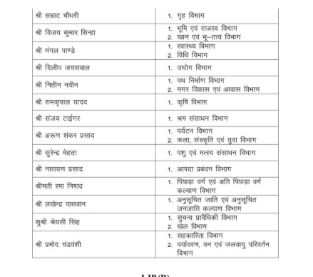 Deputy Chief Minister Vijay Kumar Sinha has been given the Land and Revenue and Mines and Geology departments. BJP State President Dilip Jaiswal will be the Minister of the Industry Department.