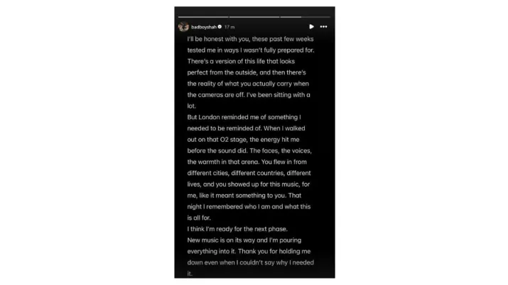 In a note shared on Instagram after a concert in London, the rapper admitted that the phase tested him in ways he had not anticipated. He also reflected on the contrast between public perception and personal struggles behind the scenes.