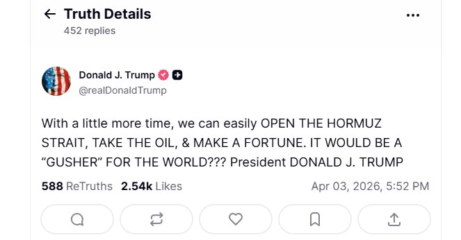 In a post on Truth Social, Trump suggested that Washington could take control of the key shipping route and its oil flows, stating that such a move could yield significant economic gains.