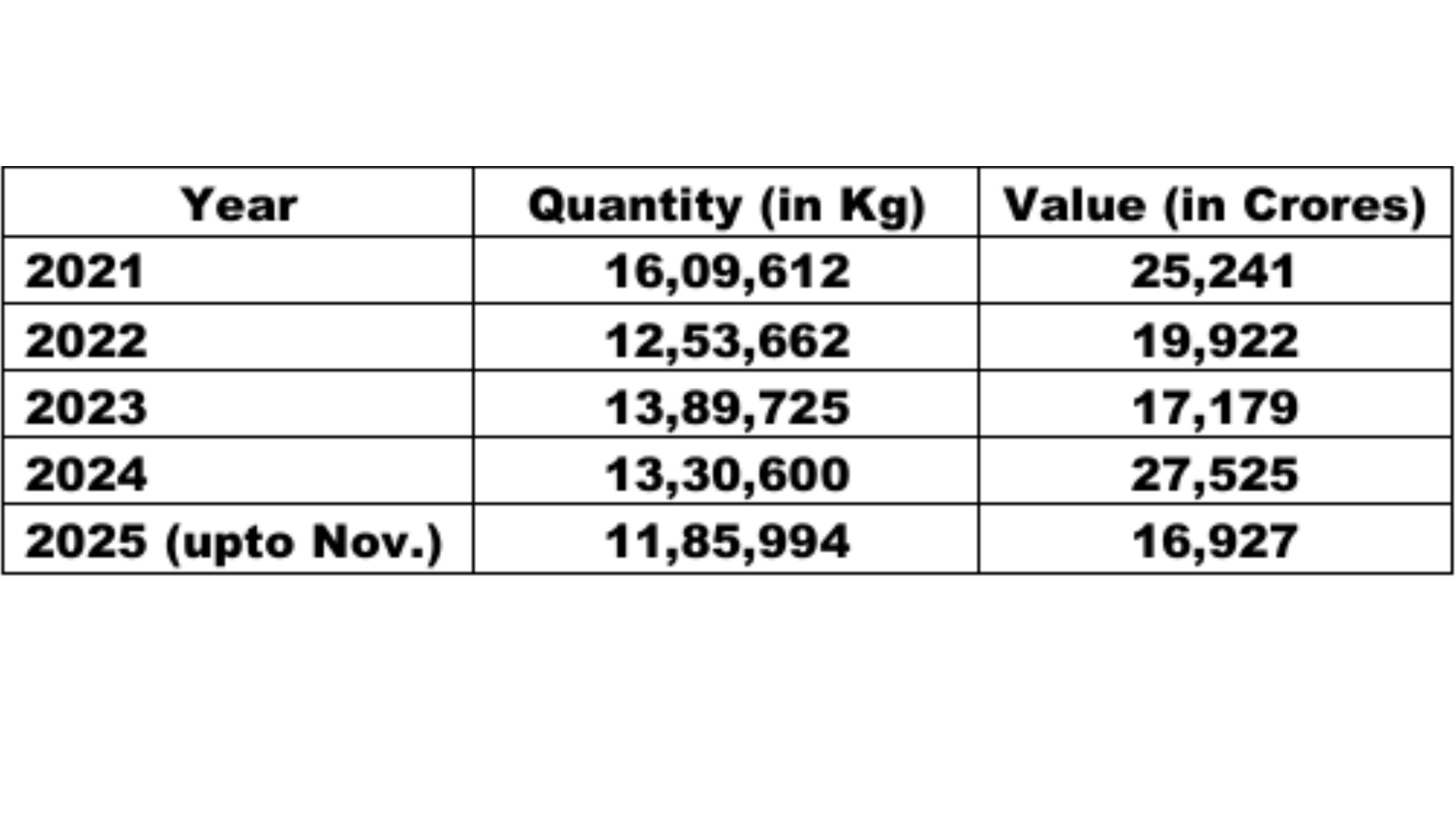 The quantum of drugs seized during 2021 to 2025 (up to November), as reported by various Drug Law Enforcement Agencies to the Narcotics Control Bureau (NCB), and their value is as under: