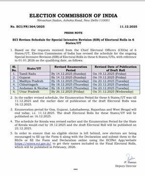 In Gujarat and Tamil Nadu, the final date for the SIR will be December 19th. While in Madhya Pradesh, Chhattisgarh, and Andaman and Nicobar Islands, the SIR campaign will continue until December 23rd.