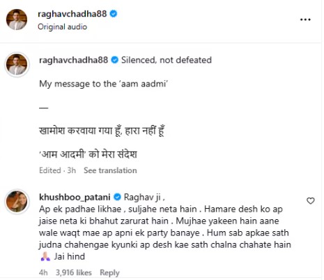 Among those backing Chadha, Khushboo Patani’s comment drew significant attention online. Praising him as an educated and composed leader, she suggested that he consider forming his own political party in the future.