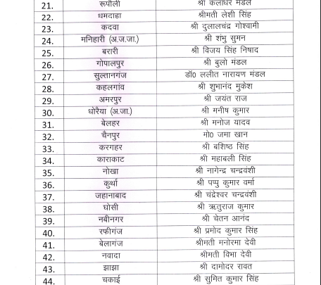 In the second list, the JDU has nominated Chetan Anand for the Nabinagar assembly seat and Manorama Devi for the Belagnj seat. The party has assigned Leshi Singh the responsibility for the Dhamdaha assembly seat. All three seats in Purnia have gone to the JDU. In addition to Dhamdaha, Saba Zafar is contesting from Aamro and Kaladhar Mandal from Rupauli.