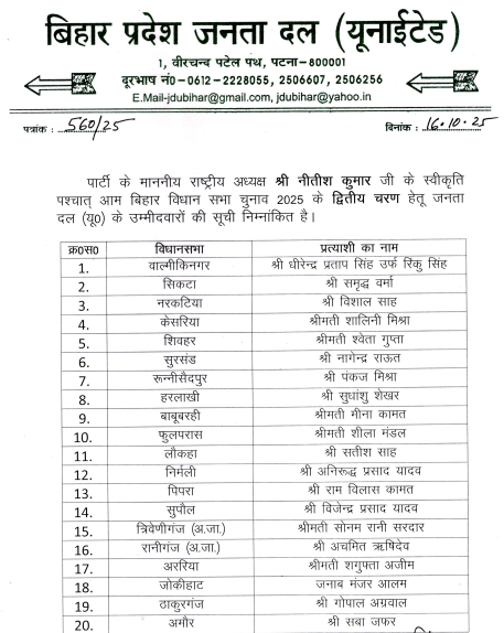 CM Nitish Kumar-headed JDU released on Thursday its final list of 44 candidates for the Bihar assembly polls.