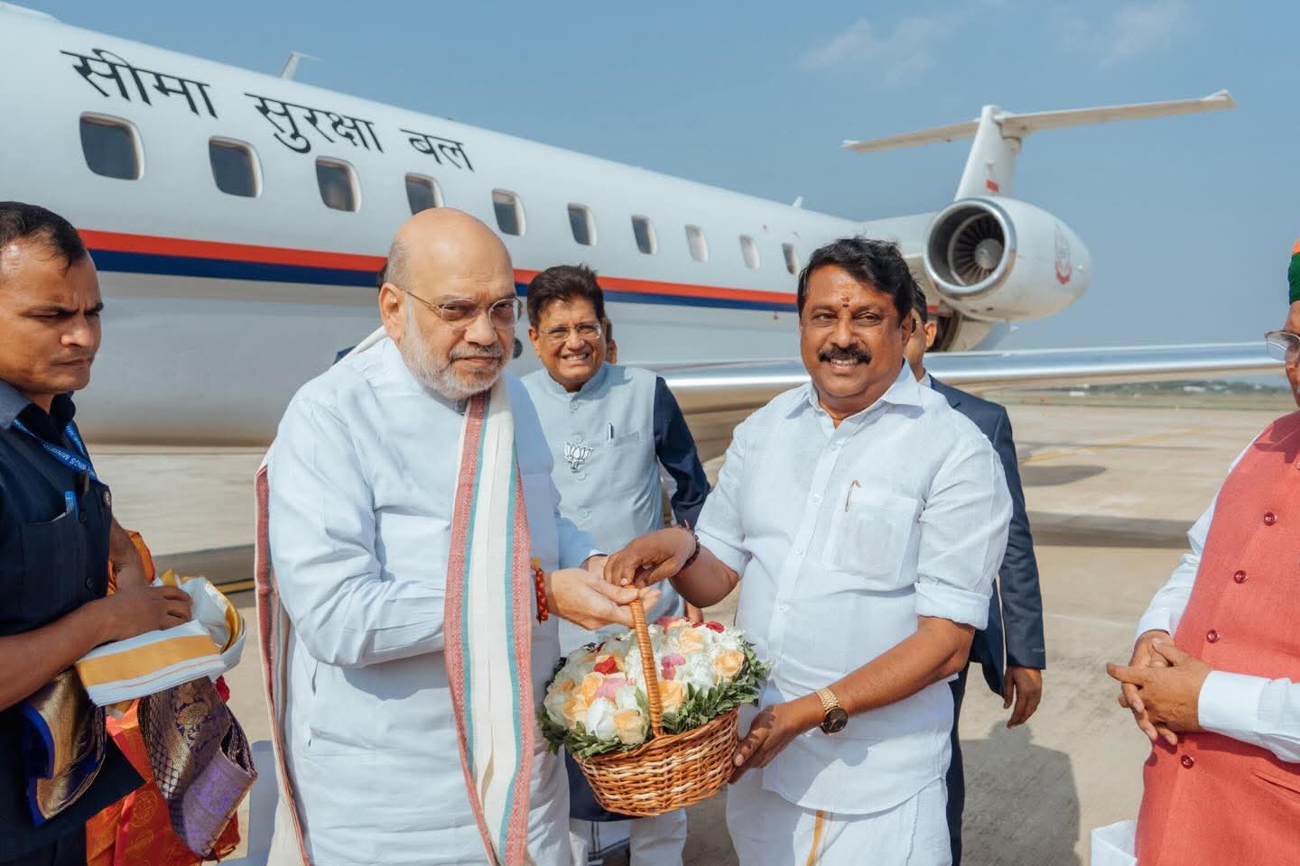 Amit Shah was welcomed at Trichy Airport by Tamil Nadu BJP president Nainar Nagendran.