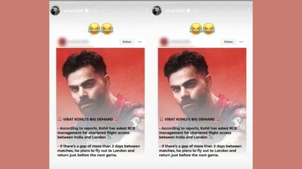 Virat Kohli has dismissed reports claiming he asked Royal Challengers Bengaluru for a chartered flight to travel to London during IPL 2026. The star batter reacted on Instagram with a laughing emoji, indirectly rejecting the viral claim.