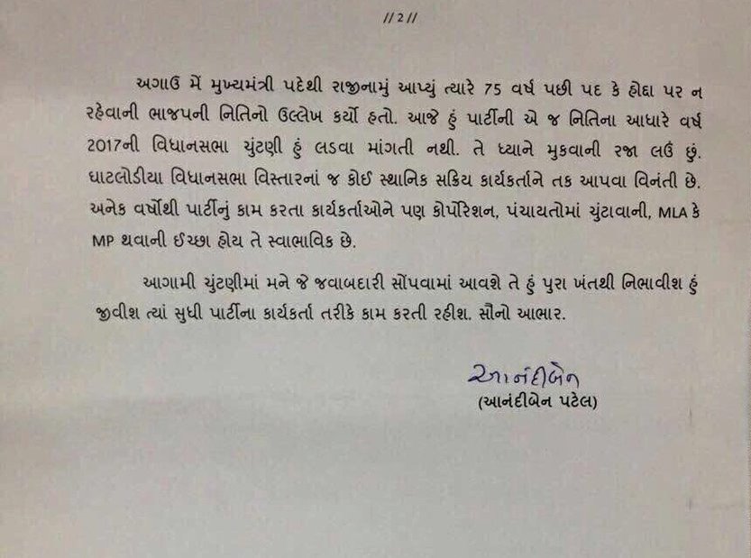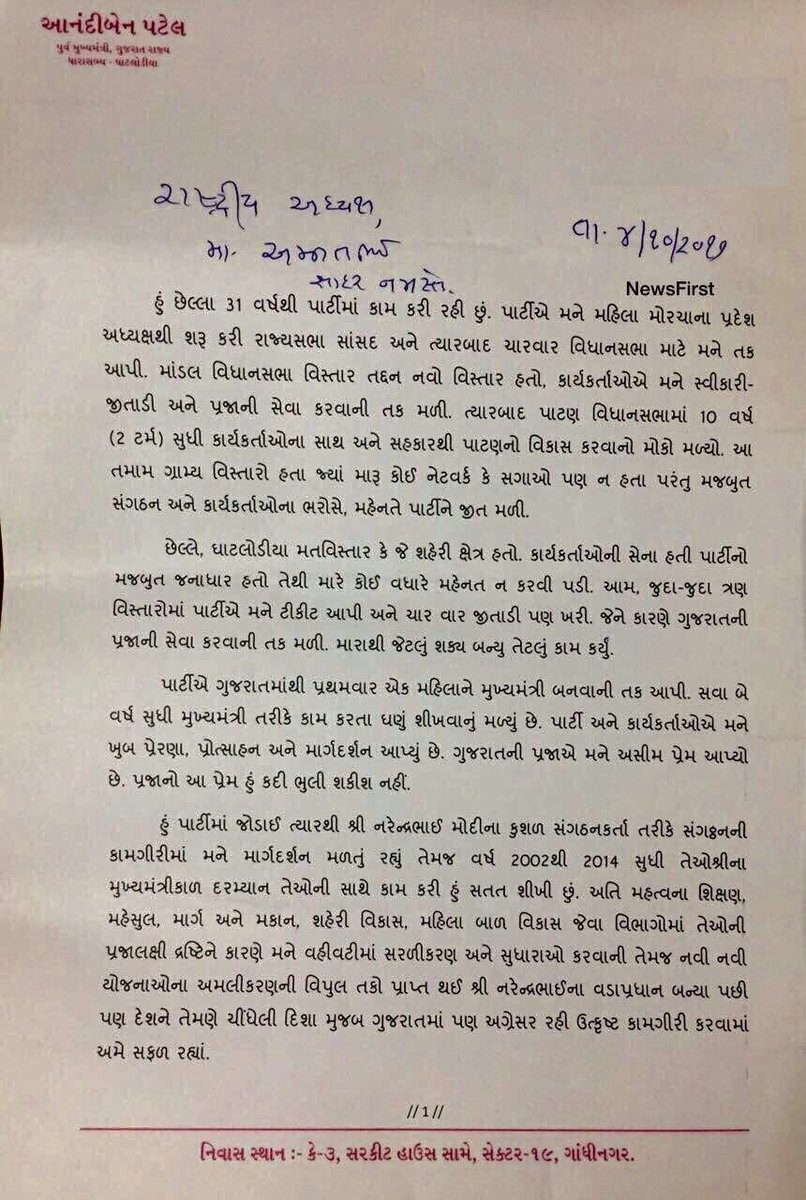 In her letter, Anandiben asserted that she has been working with the party from past 31 years and during that period, she efficiently carried out all the responsibilities that was handed over to her.