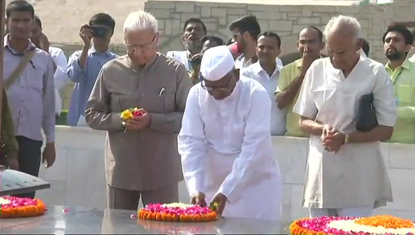 On his way to the Ram Lila Maidan, Anna Hazare paid tribute at Raj Ghat in Delhi.
