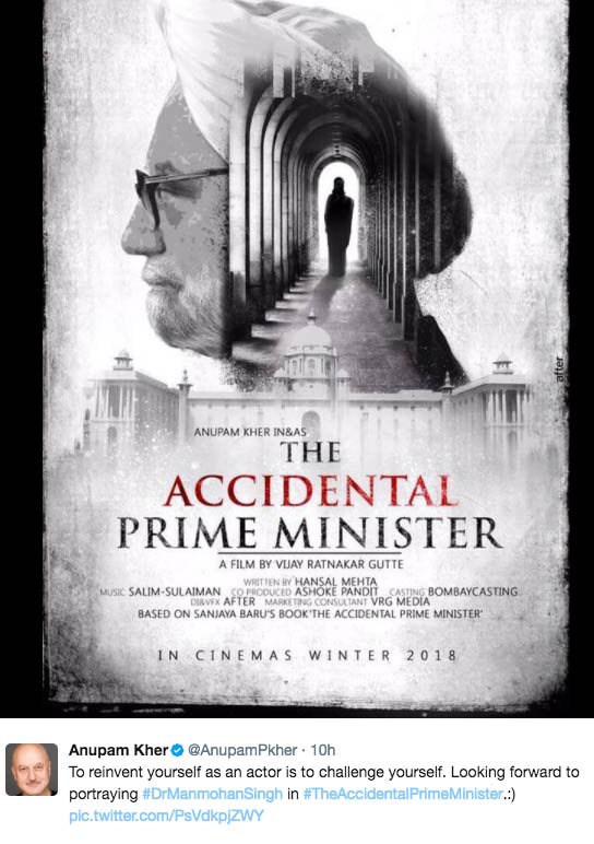 Sharing the first poster of the movie on his social media handle, Kher wrote, "To reinvent yourself as an actor is to challenge yourself. Looking forward to portraying #DrManmohanSingh in #TheAccidentalPrimeMinister.:)"