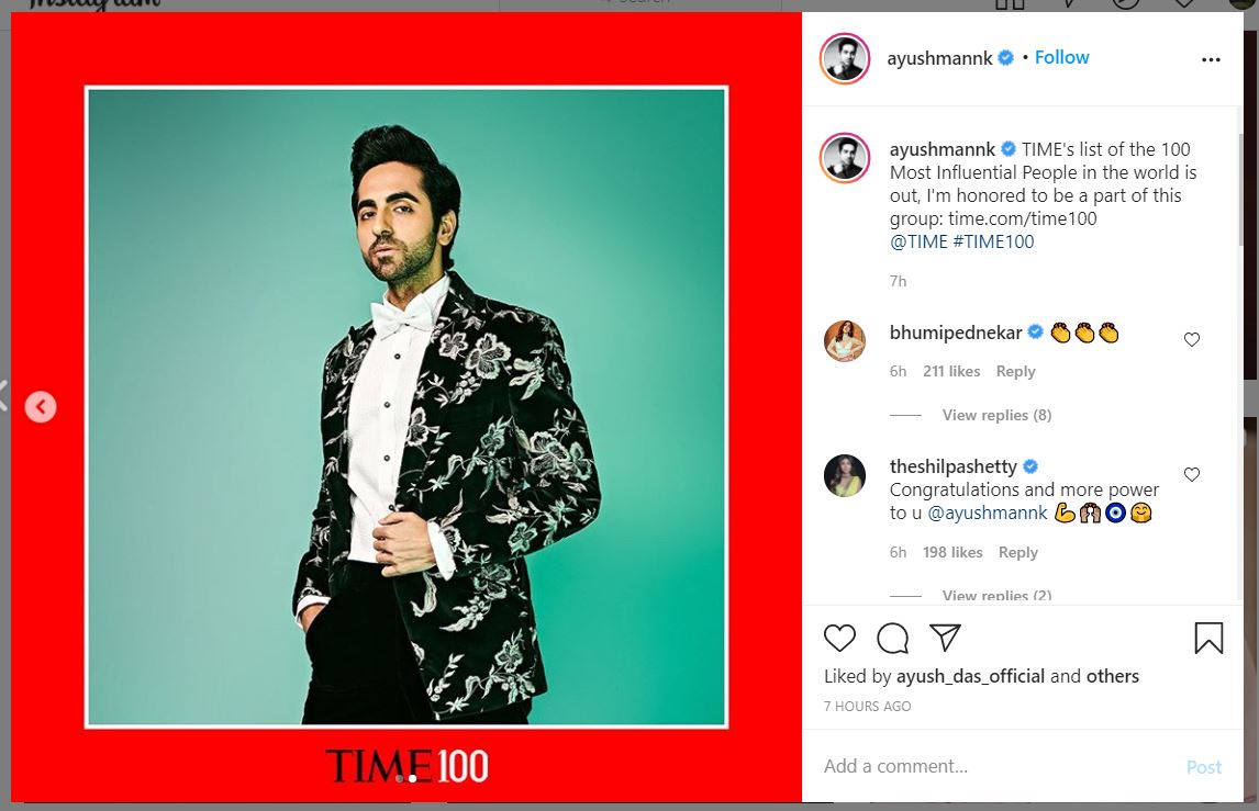 Ayushmann is among the only three global actors featured in the TIME list of influential people. Five Indians have been featured in this list, including Ayushmann. The others are Indian Prime Minister Narendra Modi, Sundar Pichai CEO of Google and London-based Indian origin doctor Ravindra Gupta, who found a cure for AIDS and Bilkis - Dadi of Shaheen Bagh. Ayushmann is the youngest Indian to be featured in this year's TIME Magazine.
