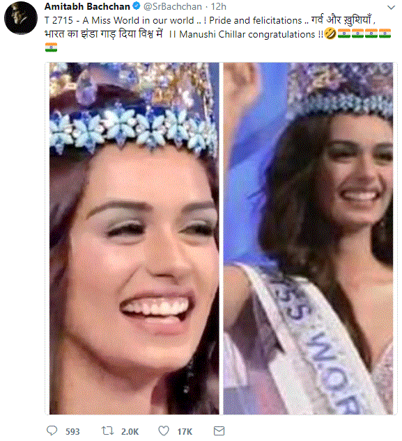 The Megastar of Bollywood Amitabh Bachchan congratulated Manushi by writing, "T 2715 - A Miss World in our world .. ! Pride and felicitations. Manushi Chillar congratulations !!"
