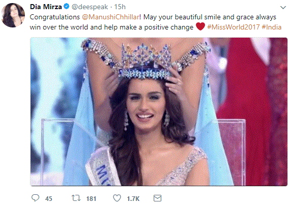 Model-turned-actress Dia Mirza, who won the title of Miss Asia Pacific in the year 2000, took the pride in the winner and tweeted, "Congratulations @ManushiChhillar! May your beautiful smile and grace always win over the world and help make a positive change #MissWorld2017 #India."