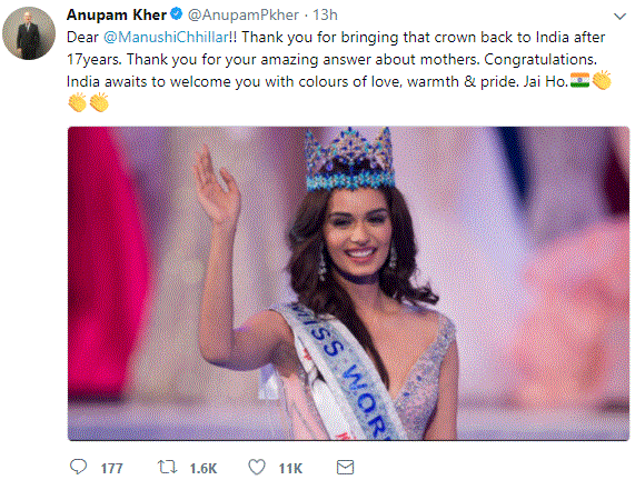 Veteran actor Anupam Kher also congratulated the 21-year-old Manushi Chhillar and tweeted, "Dear @ManushiChhillar!! Thank you for bringing that crown back to India after 17years. Thank you for your amazing answer about mothers. Congratulations. India awaits to welcome you with colours of love, warmth & pride. Jai Ho."