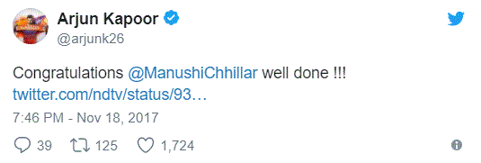 Sharing the same pride, Arjun Kapoor tweeted, "Congratulations @ManushiChhillar well done."
