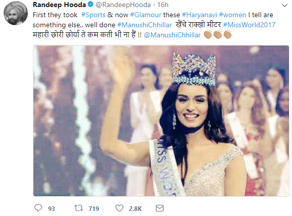 'Highway' star Randeep Hooda tweeted, "First they took #Sports & now #Glamour these #Haryanavi #women I tell are something else.. well done #ManushiChhillar #MissWorld2017 !! @ManushiChhillar"