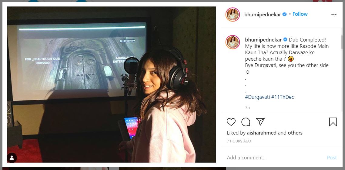 "Dub Completed! My life is now more like Rasode Main Kaun Tha? Actually Darwaze ke peeche kaun tha? Bye Durgavati, see you the other side," she wrote in the caption.