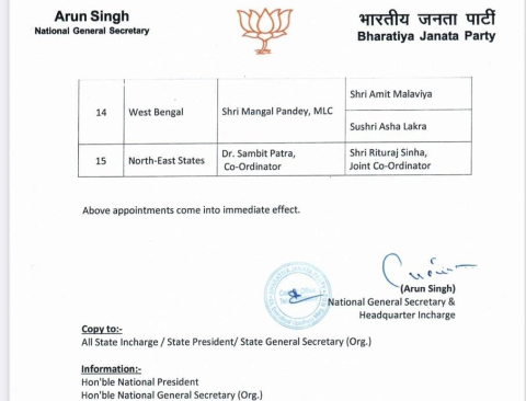 Ex-Tripura CM Biplab Deb to be the incharge of Haryana,ex-Gujarat CM Vijay Rupani to be that of Punjab-Chandigarh, ex-Bihar Minister Mangal Pandey to be that of WB & Sambit Patra to be coordinator of northeast states.