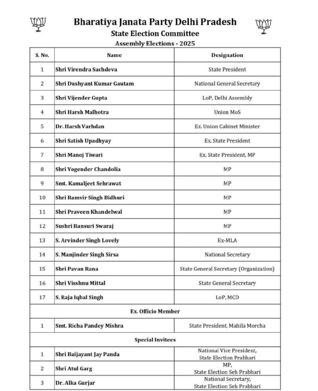 The committe comprise the names of some key leaders such as party state President Virendra Sachdeva and Leader of Oppposition in Delhi Assembly Vijender Gupta and Ex-Union Health Minister Harsh Varhdan and party Lok Sabha MP Bansuri Swaraj.