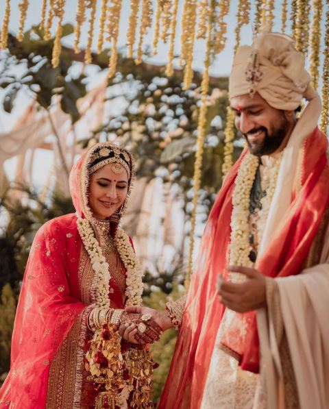 As a mark of respect to her groom's Punjabi roots, Katrina gave her wedding veil a customised touch. Isn't it absolutely lovely? According to the official Instagram page of designer Sabyasachi Mukherjee's brand, Katrina's veil was custom-trimmed with handmade kiran in hand-beaten silver electroplated in gold.