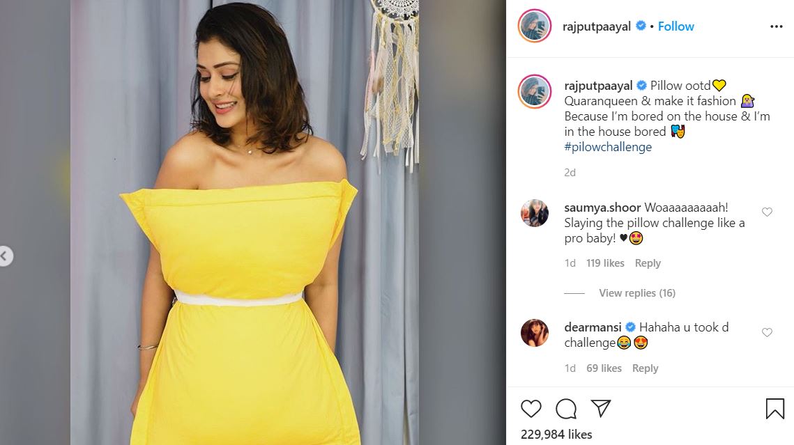 Tamil actress Payal Rajput has taken up the pillow challenge and has nailed it. She took to her Instagram page and shared her picture. She was wearing only yellow bedding.