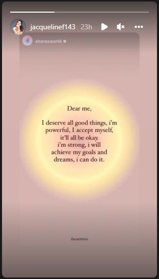 Taking to Instagram, the Jacqueline shared a post on Wednesday, which reads, "Dear me, I deserve all the good things, I'm powerful, I accept myself, it'll all be okay. I'm strong, I will achieve my goals and dreams, I can do it."