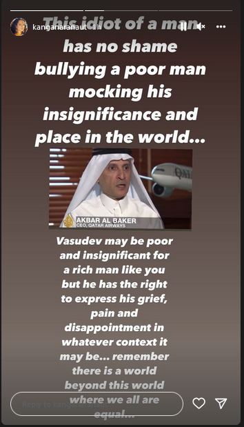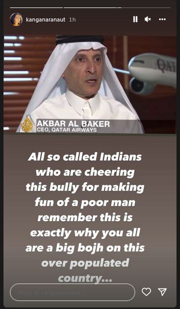 Kangana on Wednesday shared screenshots of the viral video of Qatar Airways CEO Akbar al Baker's interview, where he is seen mocking an Indian guy Vashudev for starting the '#BycottQatarAirways' trend on Twitter after Qatar stood against India for the ongoing Nupur Sharma controversy.