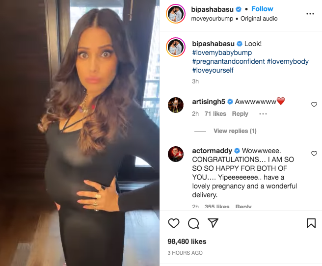 In the dubbed video, Bipasha could be seen saying 'Look I've got a baby in my belly' as she shows her baby bump in a black bodycon dress.