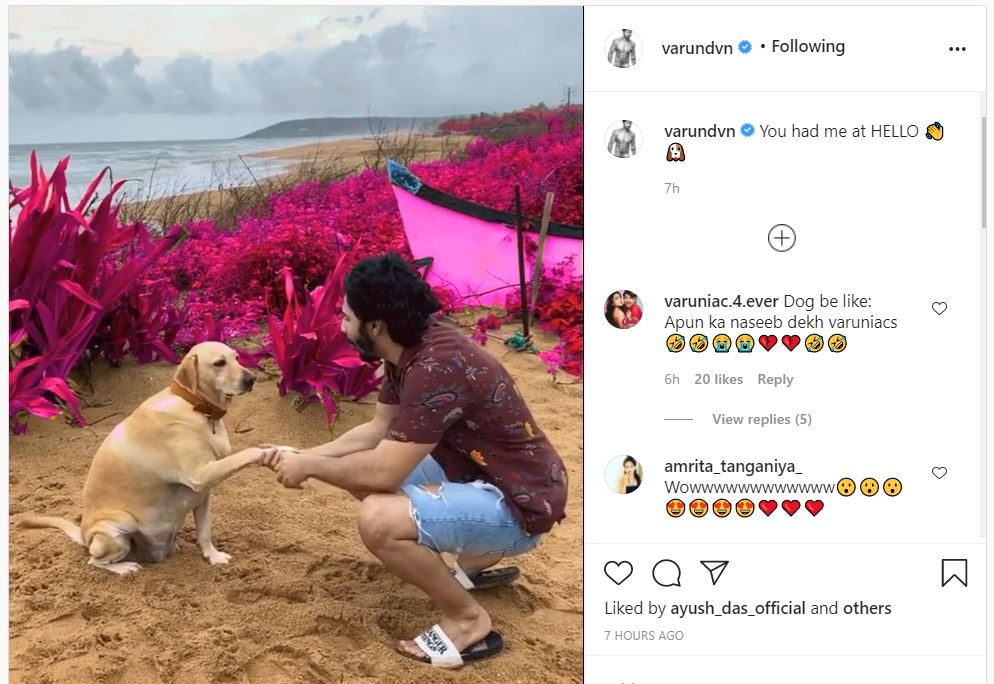 The 'Badlapur' actor posted a cute boomerang to Instagram where the actor is seen shaking hands with his four-legged friend. The short clip captured amid the picturesque view of a beach shows Varun sporting a casual look as donned a T-shirt and ripped denim shorts while he sat nearby the dog and shook hands with him.
