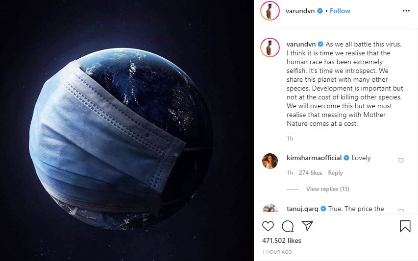 Varun posted the message on Instagram account with the picture of Earth covering with a mask. He captioned: As we all battle this virus. I think it is time we realise that the humanvarun race has been extremely selfish. It’s time we introspect. We share this planet with many other species. Development is important but not at the cost of killing other species. We will overcome this but we must realise that messing with Mother Nature comes at a cost.