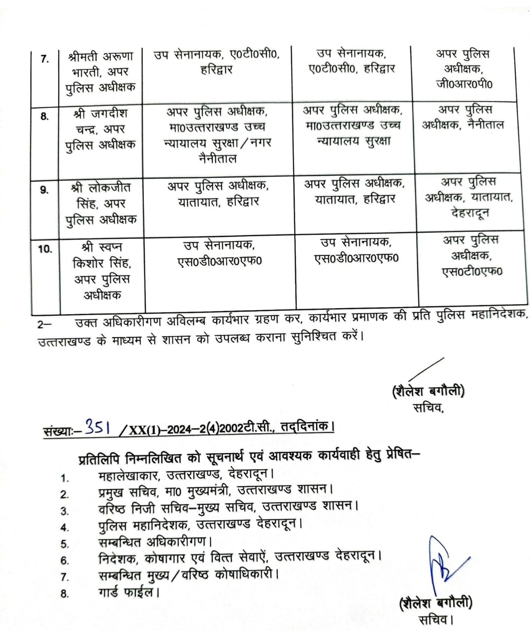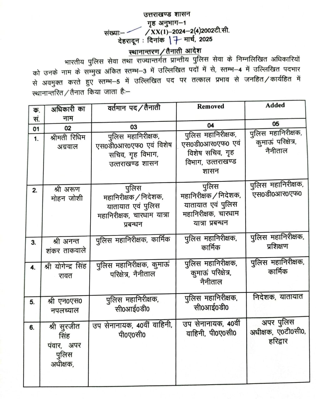 Dehradun: The Uttarakhand Government has made major reshuffle in the state police department late Monday night as 10 IPS officers were trasferred.
