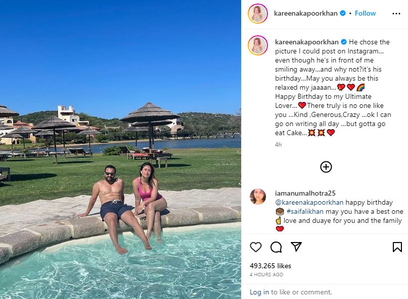 As Saif turned 53 on Wednesday, Kareena took to Instagram and dropped a cool picture from her pool time with hubby.
