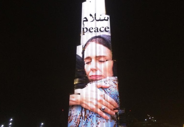 New Zealand Prime Minister Jacinda Ardern’s hijab-clad picture was projected on the world’s tallest building, the Burj Khalifa, on Friday night.