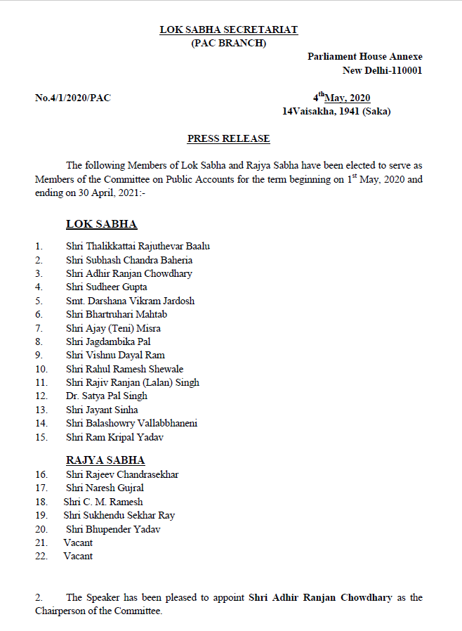 Congress leader in Lok Sabha Adhir Ranjan Chowdhury has been appointed as the Chairperson of the Parliamentary Committee on Public Accounts (PAC) for the term beginning on May 1, 2020, and ending on April 30, 2021.