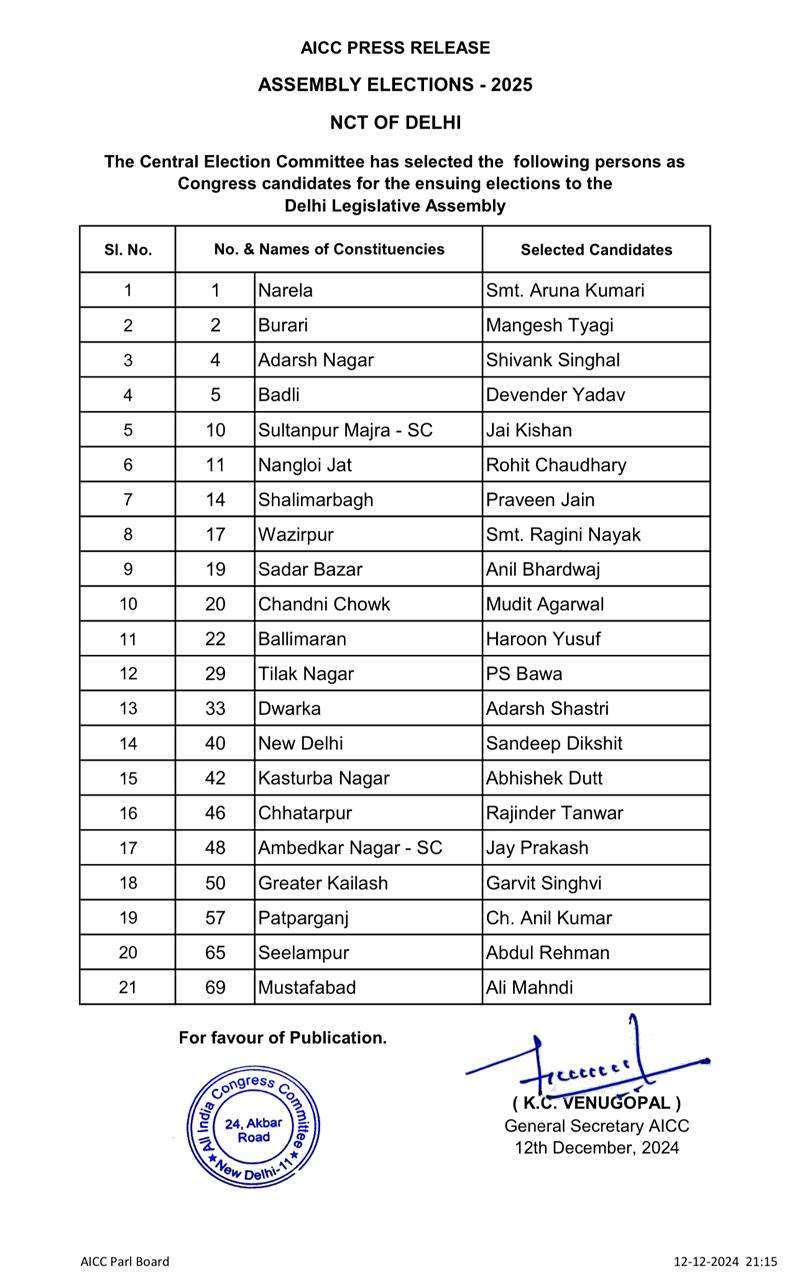 New Delhi: Congress on Thursday issued its first list of 21 candidates for the upcoming Delhi Assembly Polls.