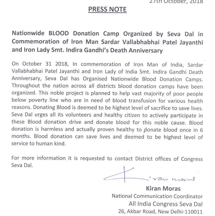 Congress Seva Dal to organized a nationwide blood donation camp In Commemoration of Iron Man Sardar Vallabhabhai Patel and Indira gandhi’s death anniversary on 31st October. Full Story..