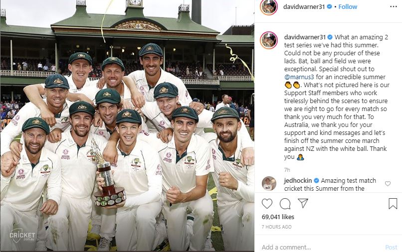 Warner posted a photo on Instagram and captioned the post as--"What an amazing 2 test series we've had this summer. Could not be any prouder of these lads. Bat, ball, and field we were exceptional. Special shout out to @marnus3 for an incredible summer".