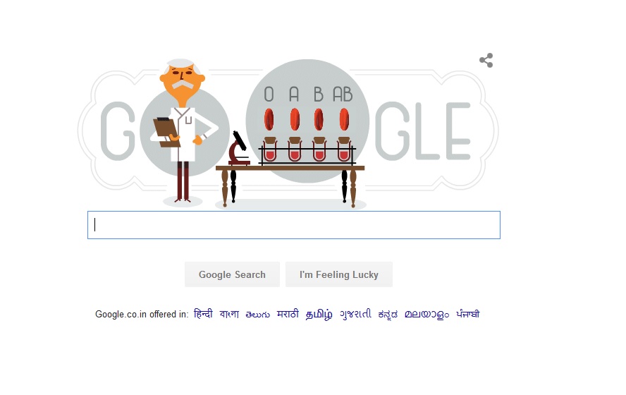 New Delhi/ 14 June 2016. Google pays tribute to Nobel laureate Karl Landsteiner on his 148th birth anniversary. He was born on 14 June 1868 in Vienna, Austria.