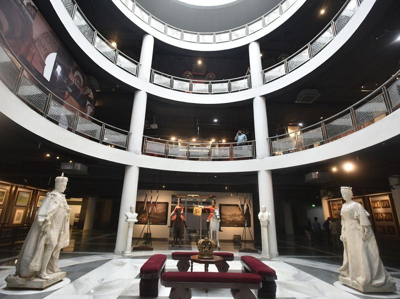 The three storey of the Rashtrapati Bhavan Museum are seen along with statues of King George (left) and Queen Mary(right).