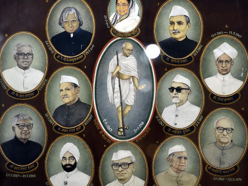 Portraits of Mahatma Gandhi and former presidents of India in the Rashtrapati Bhavan Museum.