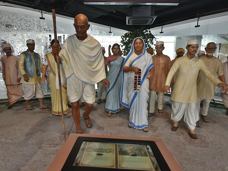 Mahatma Gandhiâs Dandi March, an act of civil disobedience in colonial India, is portrayed at the Rashtrapati Bhavan Museum in New Delhi.