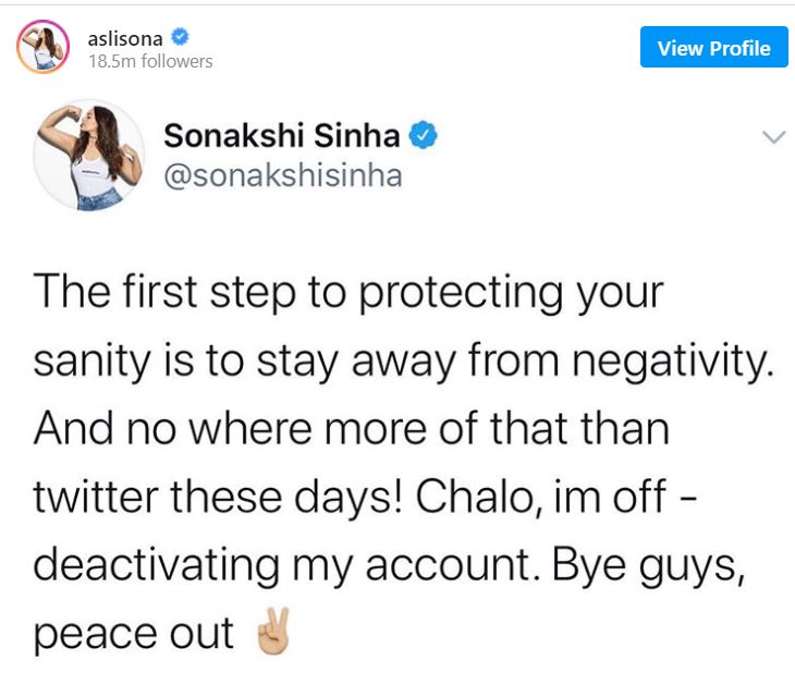 Sinha shared the information with her Instagram followers by posting a screengrab of her own tweet where she explained her move behind deactivating.