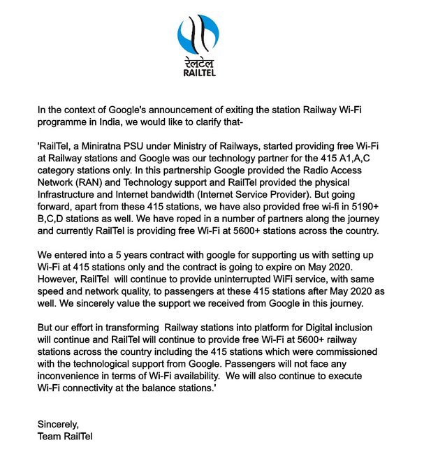 "We entered into a 5 years contract with Google for supporting us with setting up Wi-Fi at 415 stations only and the contract is going to expire in May 2020. However, RailTel will continue to provide uninterrupted WiFi service, with the same speed and network quality, to passengers at these 415 stations after May 2020 as well," the release added.