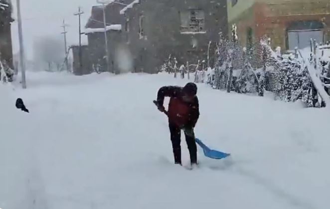 Visuals show a man clearing snow in front of his residence with the help of a shovel amidst the soft falling flakes.