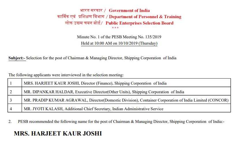 New Delhi: Harjeet Kaur Joshi has been appointed as Chairman and Managing Director (CMD), Shipping Corporation of India on Thursday by the selection committee of Public Enterprises Selection Board (PESB).