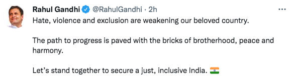 "Hate, violence and exclusion are weakening our beloved country. The path to progress is paved with the bricks of brotherhood, peace and harmony. Let's stand together to secure a just, inclusive India," Gandhi said on Twitter.